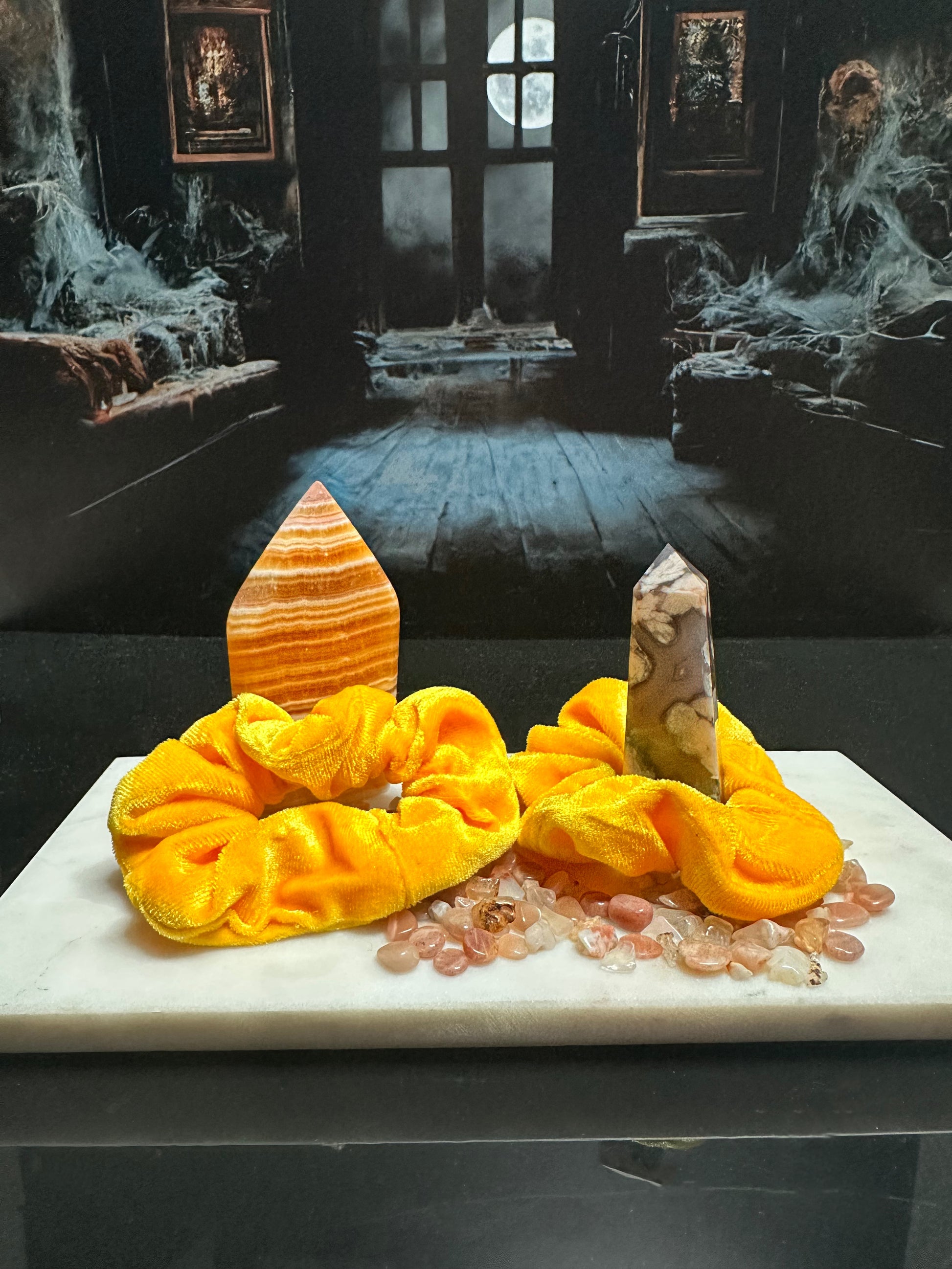 Add a touch of luxury and positivity to your collection with this stunning Sunshine Yellow velvet scrunchie! Crafted from soft, rich velvet, it feels as good as it looks, offering both comfort and a vibrant pop of color! This joyous scrunchie includes the following crystals: